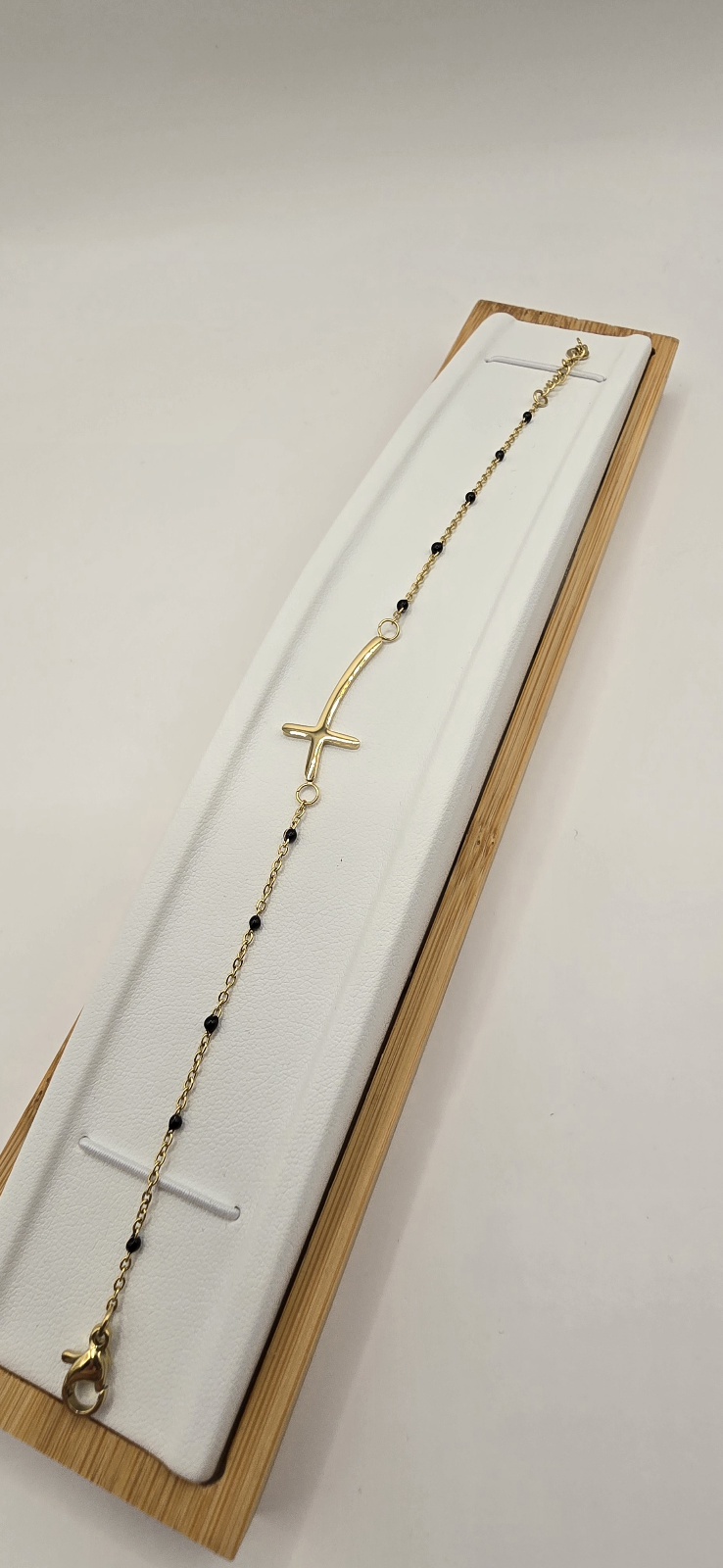 Celebrytka czarne koraliki krzyżyk 17cm+4cm S.STEEL 316L
